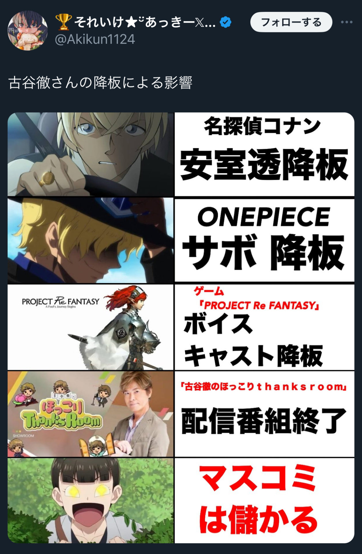 不倫したのも降板したのも古谷徹サイドの都合でマスコミは報道してるだけだろ…