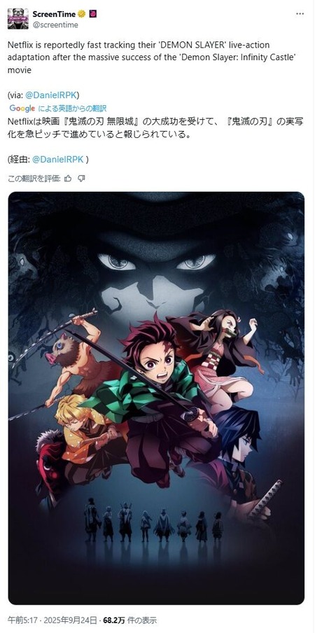【速報】鬼滅が世界中で大ヒットしたためネトフリが実写化の準備に入る