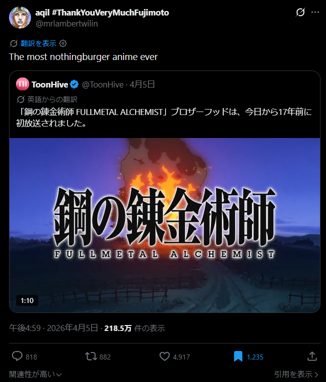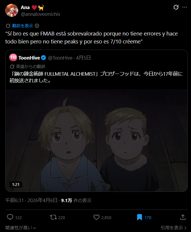 鋼の錬金術師、Xで炎上してしまう